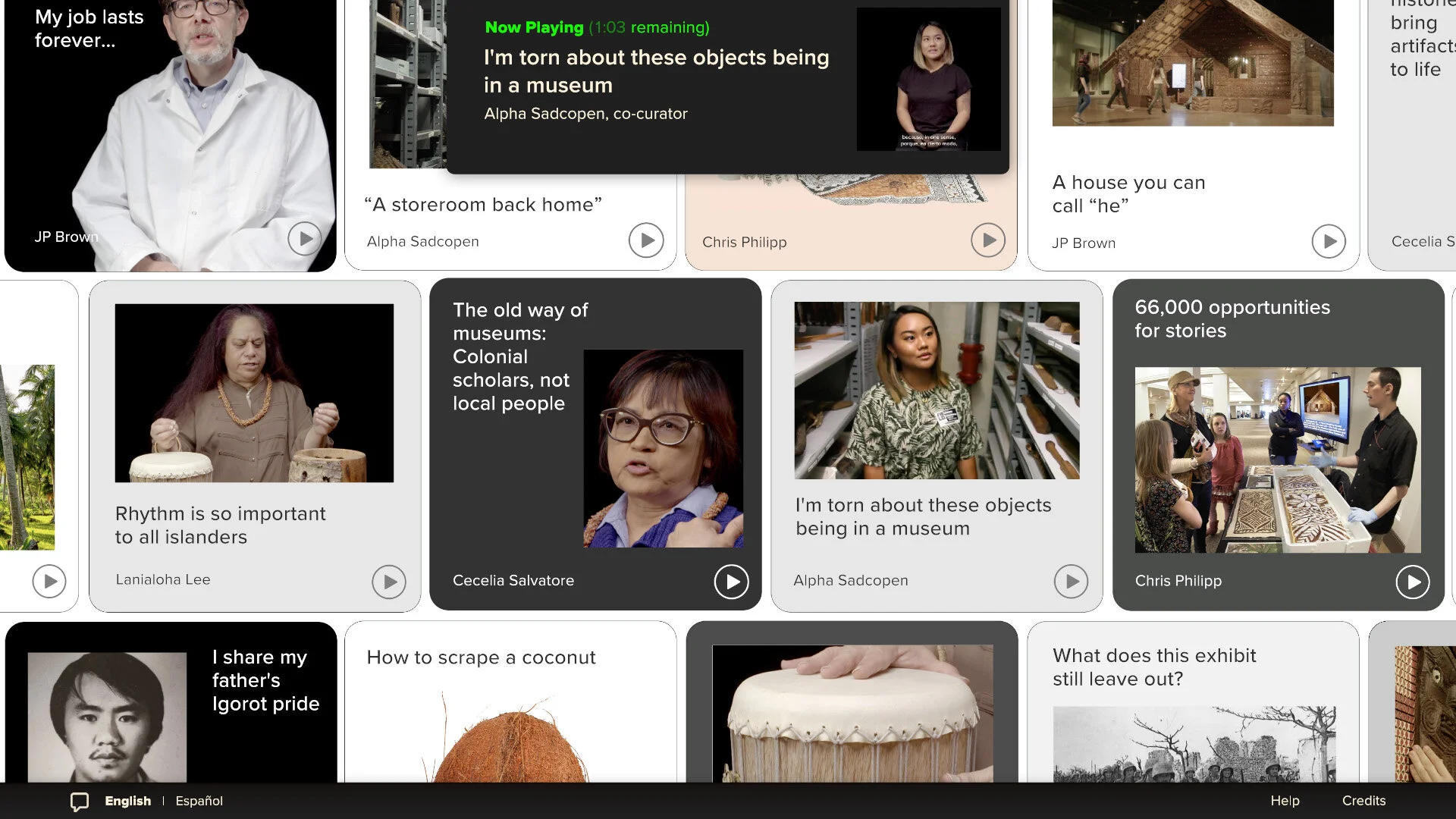 In early discussions, the museum expressed a desire to let members of local communities who had participated in co-curatorial activities speak for themselves in a direct and unfiltered manner. We worked hard to create a safe and welcoming filming environment and make it clear that no topic was off the table. The result of two in-depth days of filming is a range of often-emotional stories about lived experiences as “the other” in America, the challenges and joys of maintaining a connection to tradition and identity, and mixed feelings about how museums depict cultures and hold objects that represent traditions. Many video clips are rooted in the museum’s Pacific collection and use objects that the participants chose that connected with their lives.